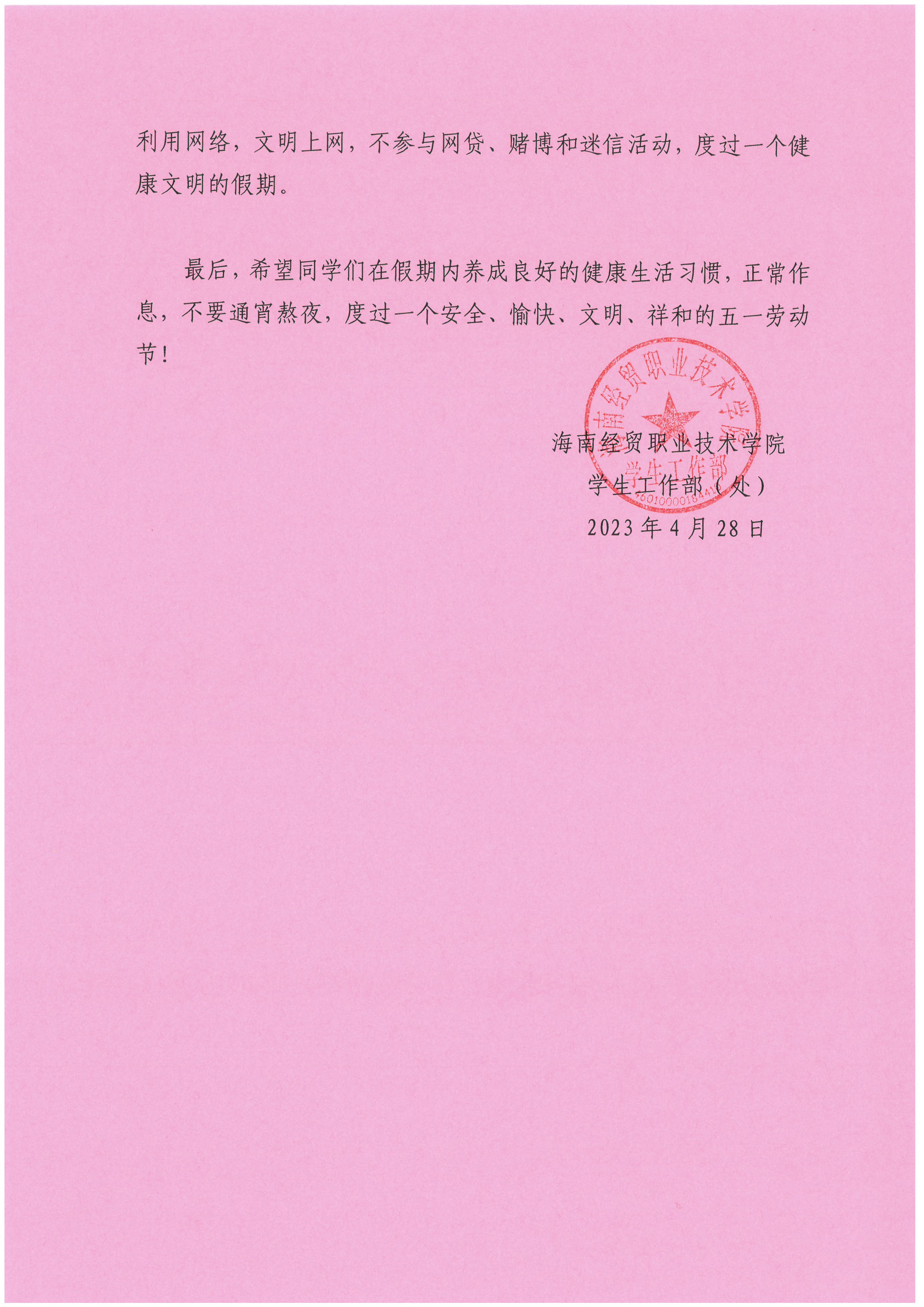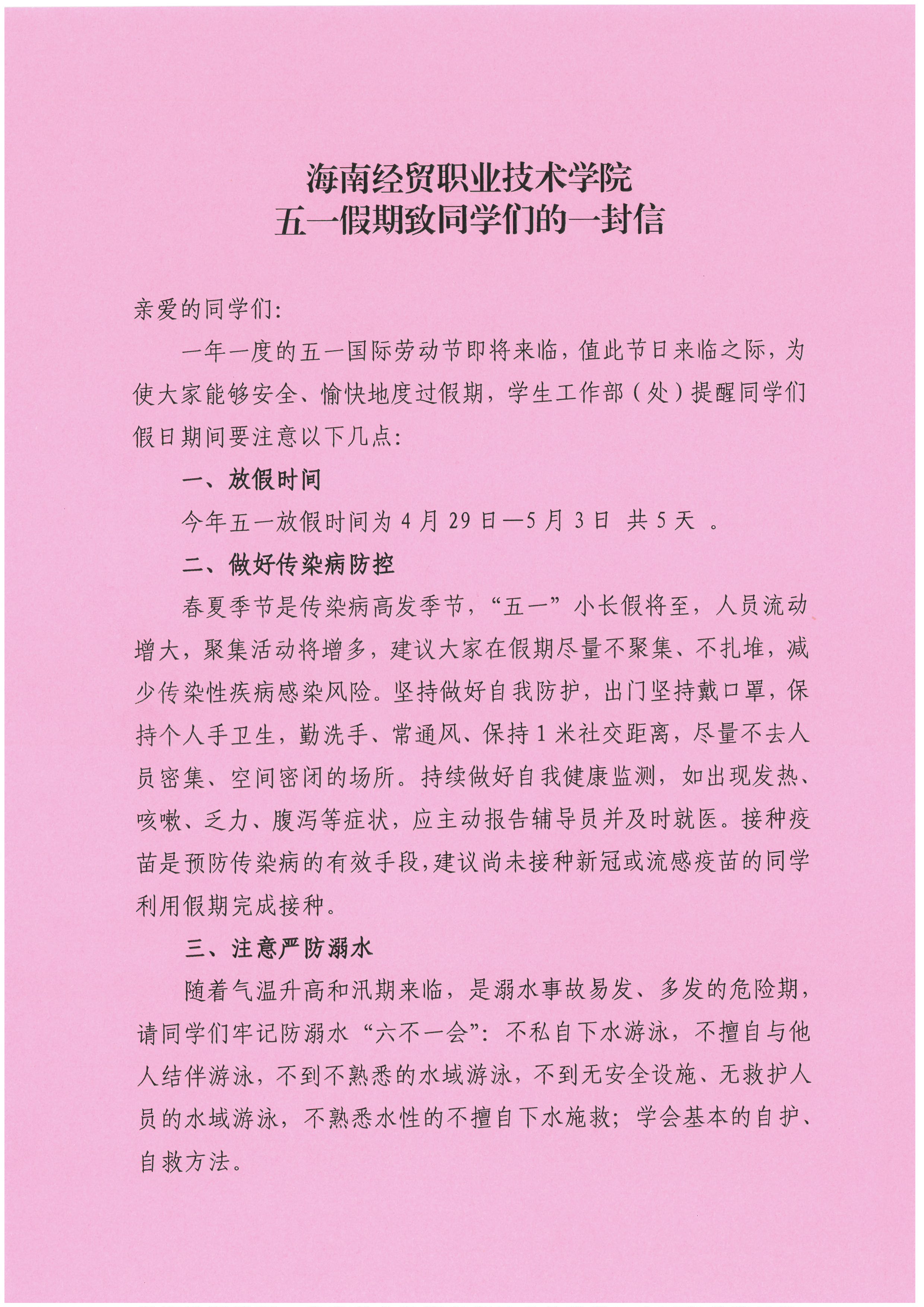 2138CC太阳集团五一假期致同学们的一封信
