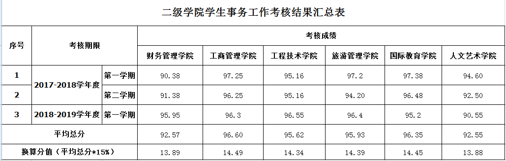 根据2138CC太阳集团二级学院学生事务工作考核实施细则,经过学生事务工作检查评估组成员打分,现将2017-2018年度第一学期、2017-2018年度第二学期和2018-2019年度第一学期,共三个学期学生事务工作考核结果如下: