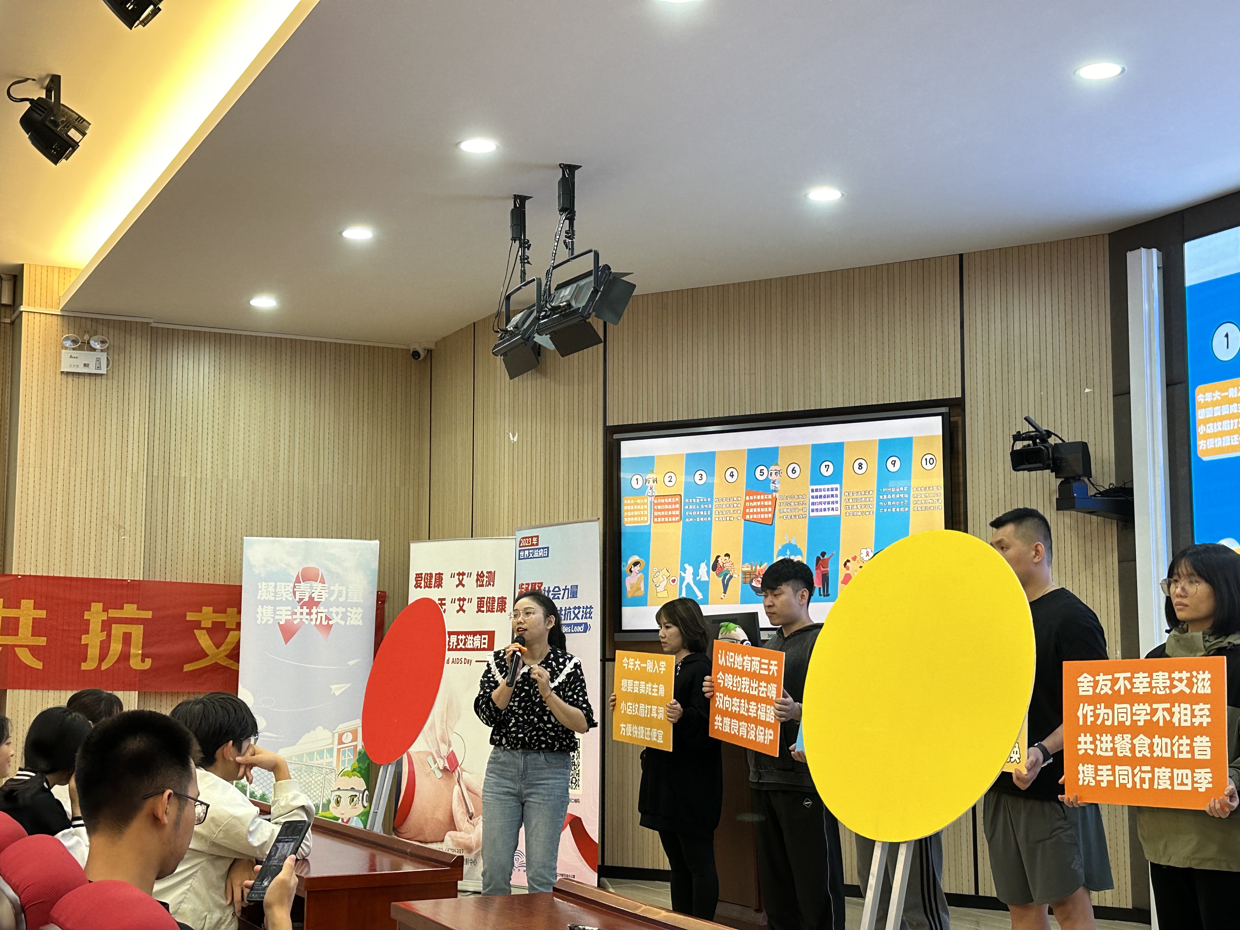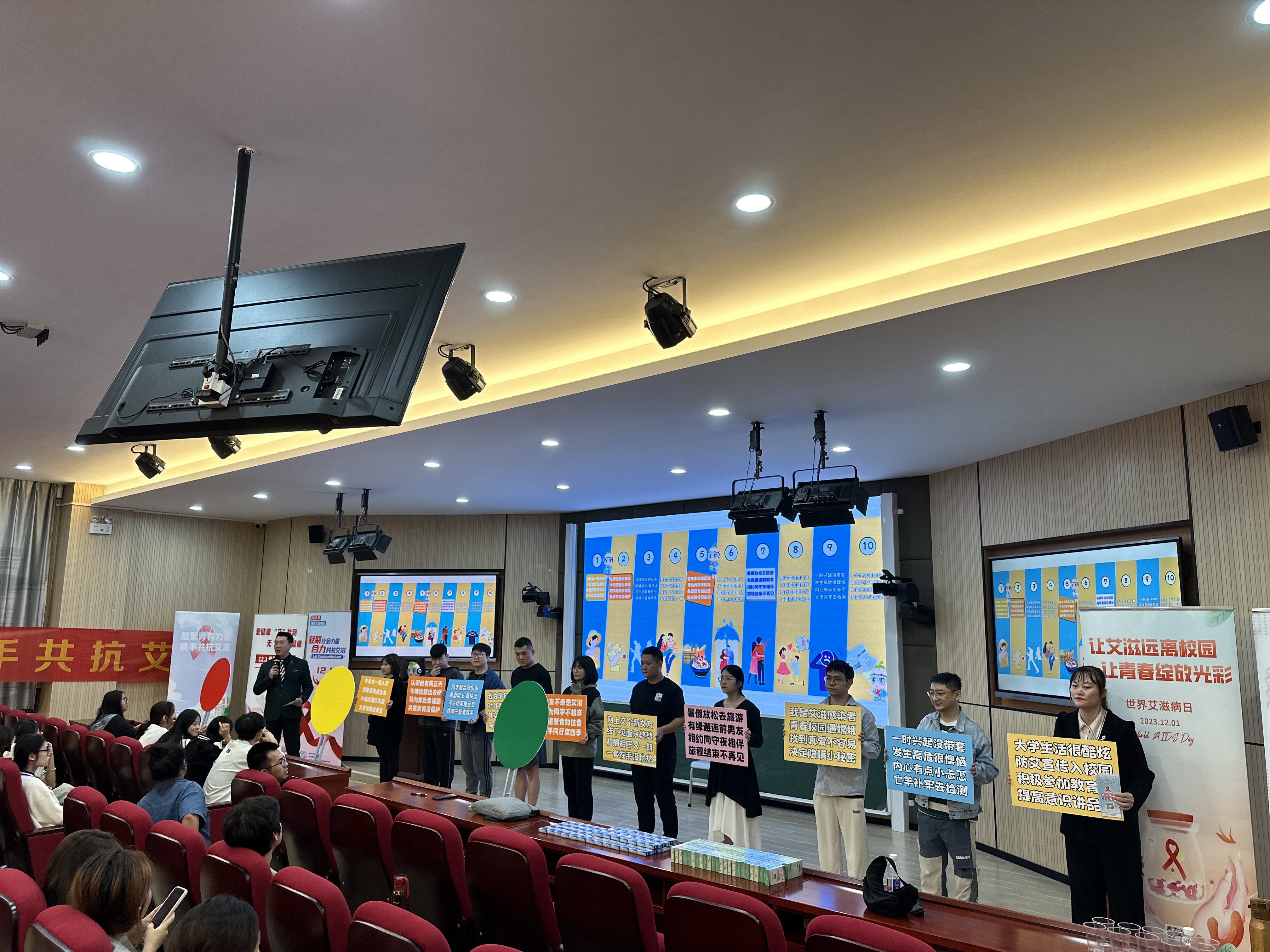 海口市高校艾滋病防治宣讲团的老师们首先结合演员表演的十种个人行为,为师生们分析了哪些行为是主张的、哪些行为是需要警示的、哪些行为是需要拒绝的,引导师生筑牢防艾的第一道防线。通过表演和讲座结合的形式,热情耐心地向我院学生讲解艾滋病的基本知识、传播途径、预防措施、对个人和社会的影响、艾滋病防治策略等,用形象的语言,生动的案例,声情并茂的阐述预防艾滋病的重要性和紧迫性,提醒我院学生在日常生活中要提高防艾意识,积极学习和了解艾滋病防治相关知识。