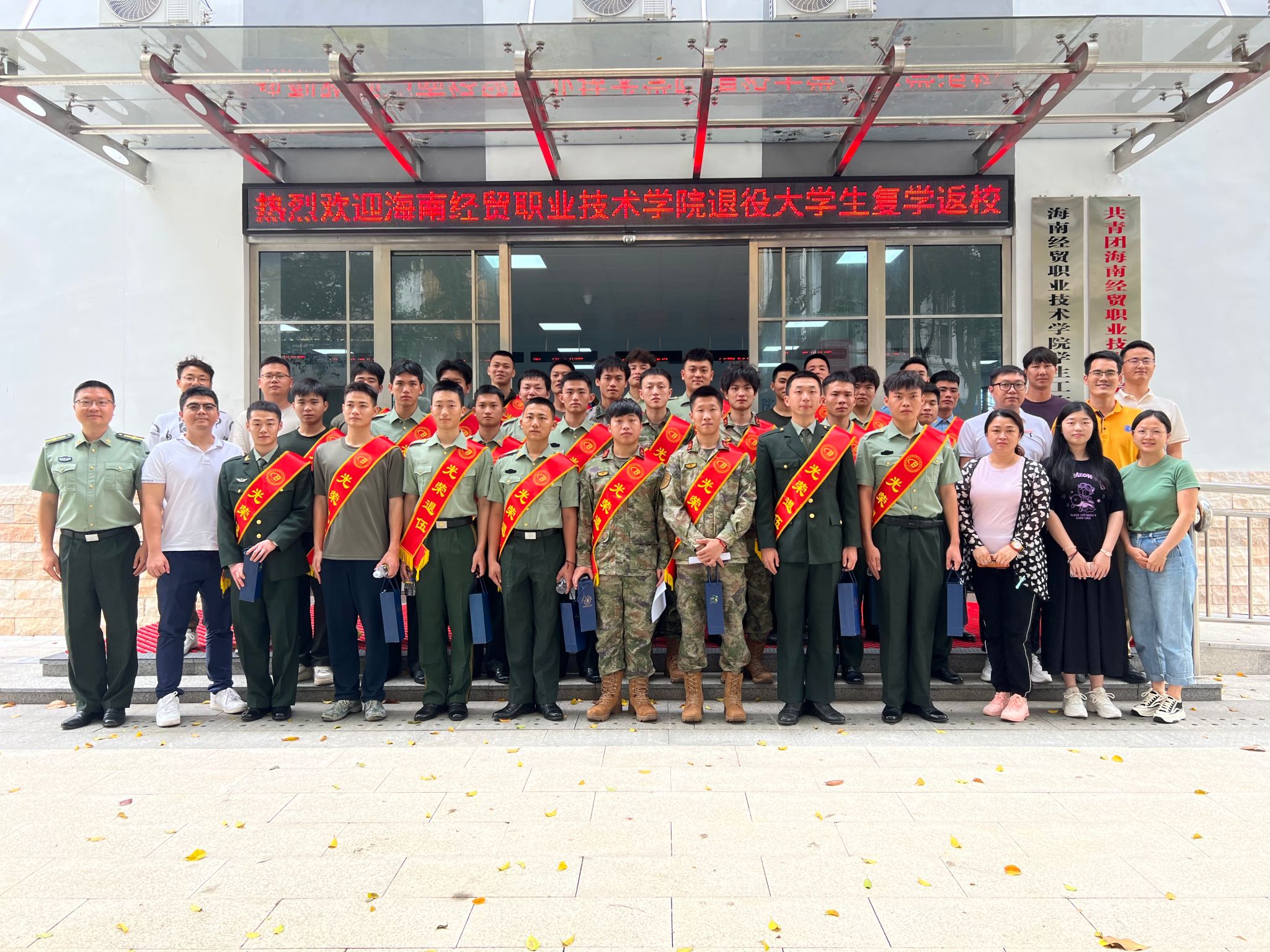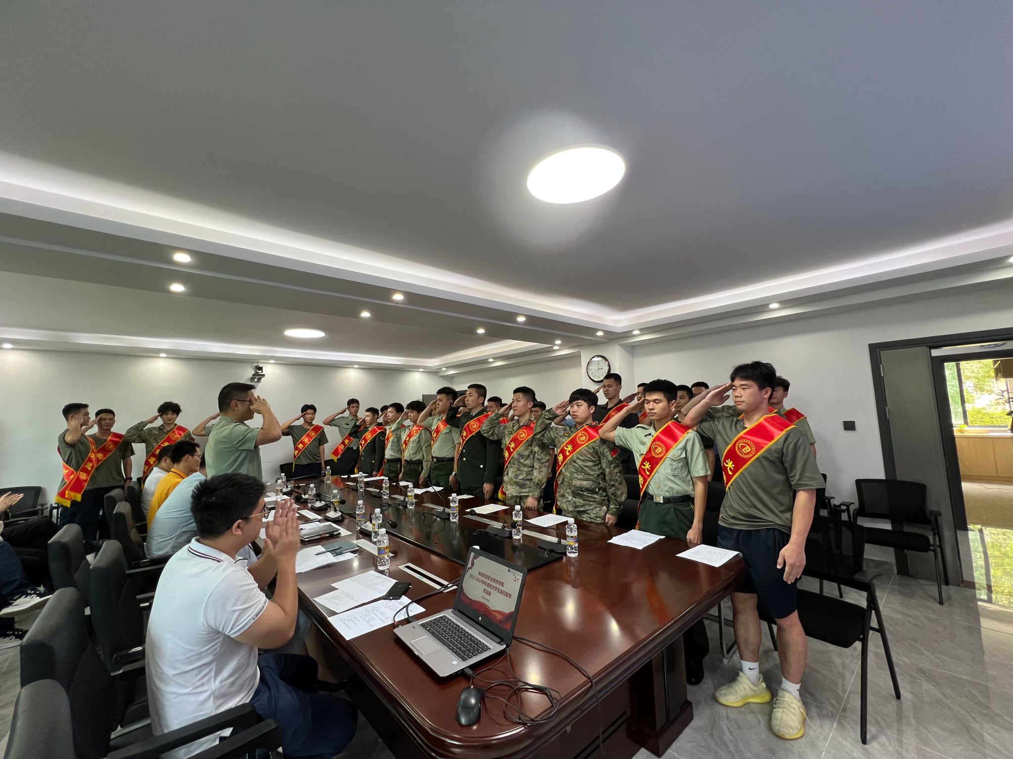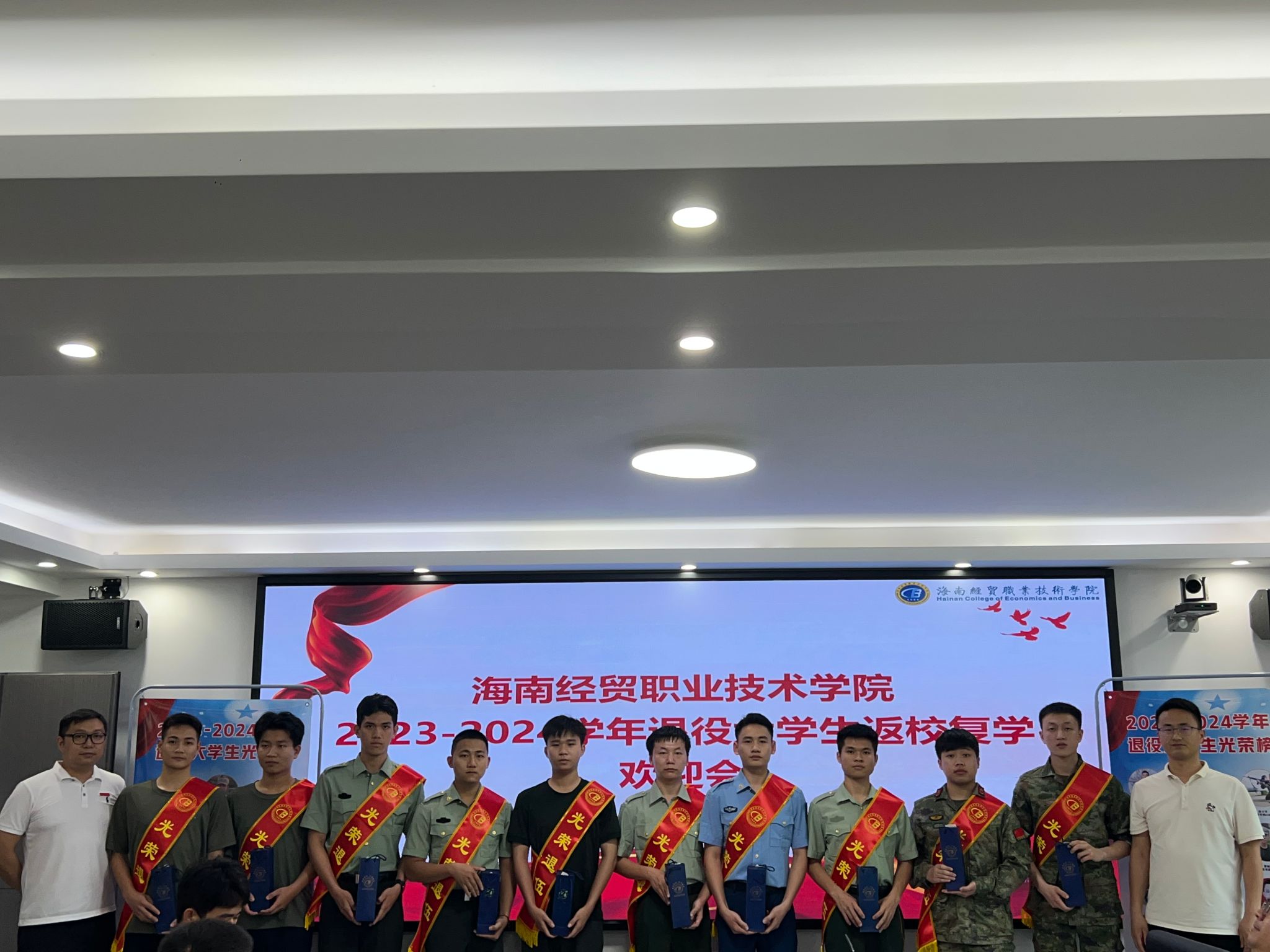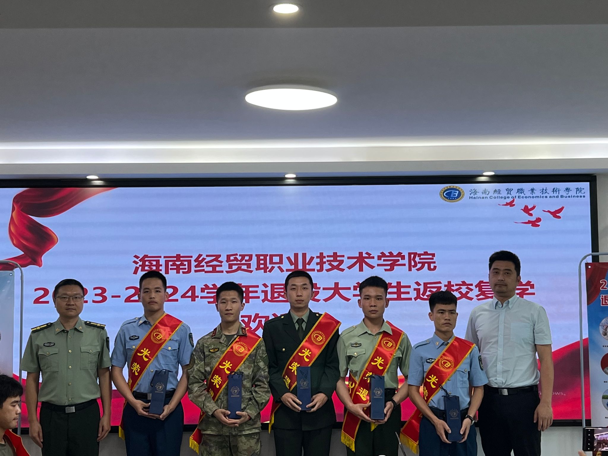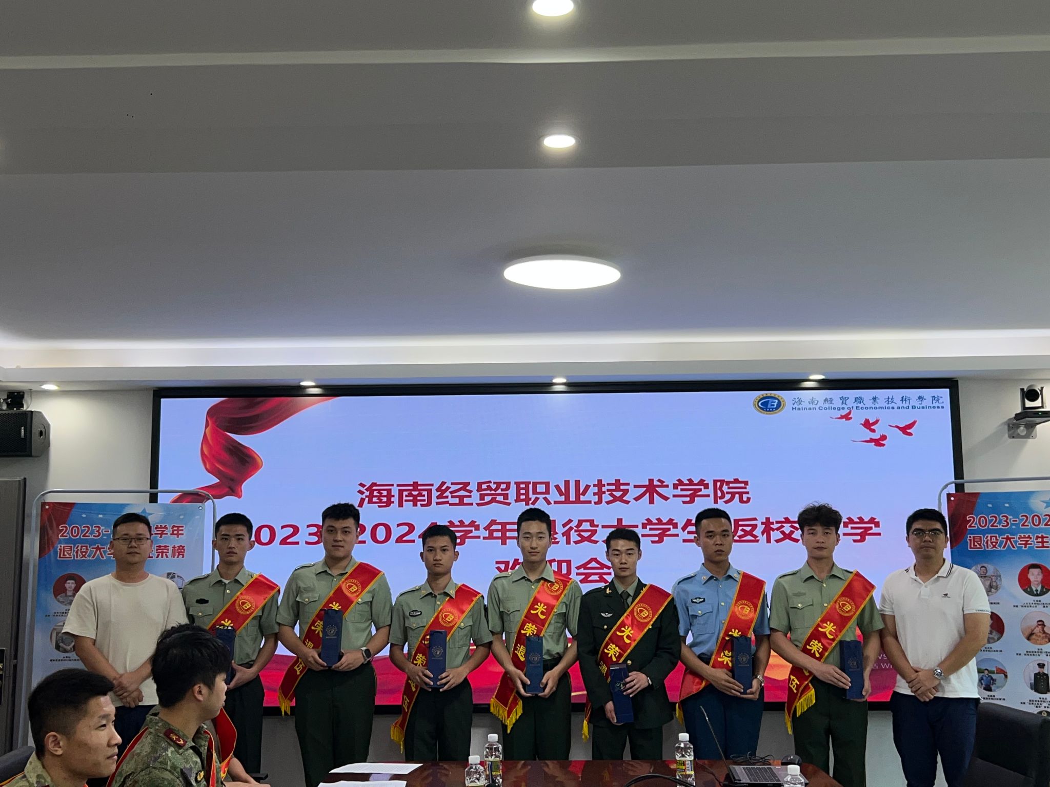 会上,学院武装部部长彭陈俊对32名退役大学生进行点名,每一位学生的答“到”声铿锵有力、气宇轩昂,与会老师都感受到海经贸退役大学生的转变与成长。随后,为退役大学生佩戴绶带,发放纪念品。