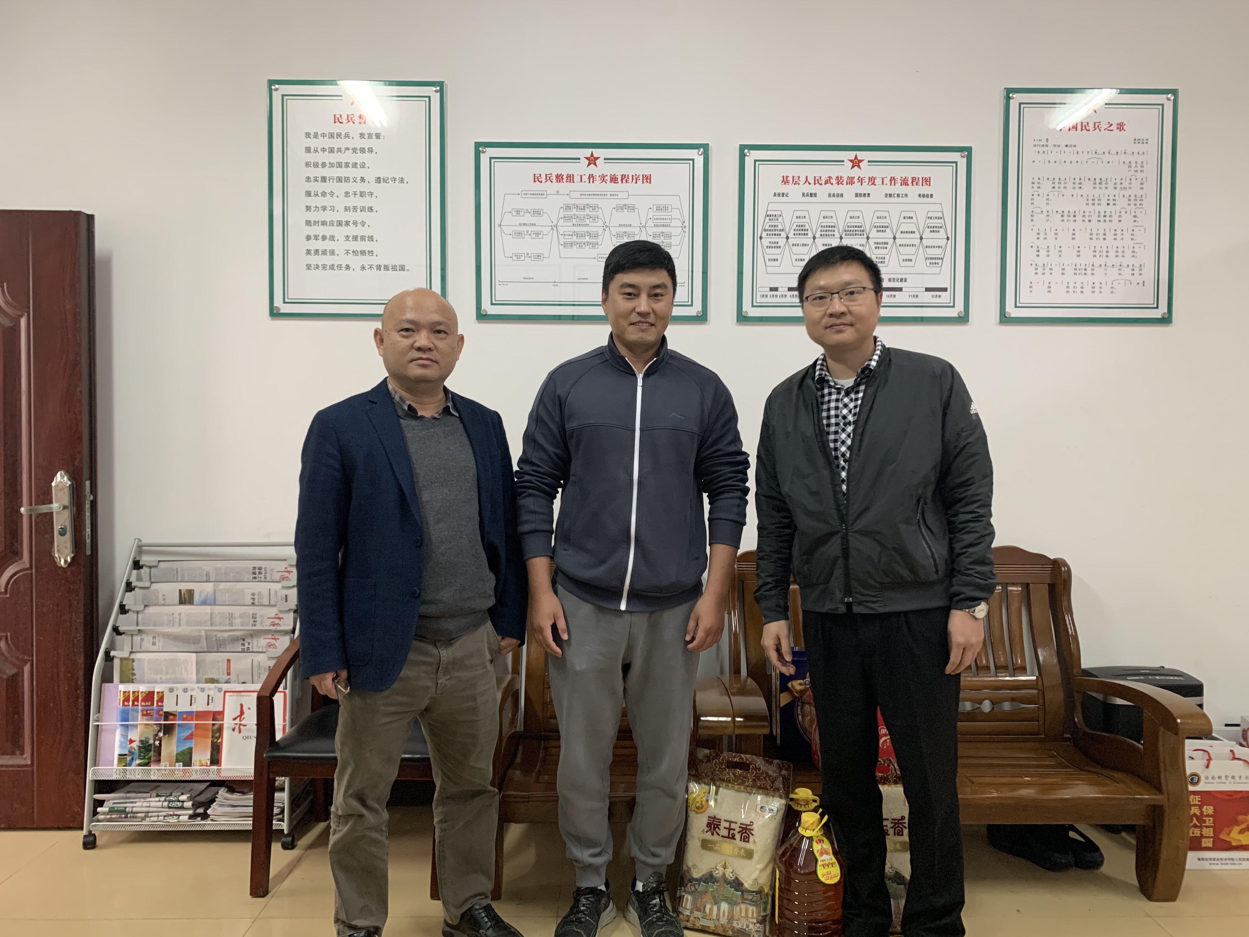 学院学生工作部(处)副部长符绩彰、学院人民武装部部长彭陈俊与退役士兵合影