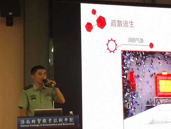 海口消防美兰区大队桂林洋中队吴队长应邀讲授消防理论知识。他以一个个真实生动的案例,为参训老师讲解了火灾危害与消防工作、学校火灾及预防、消防器材及使用方法、消防安全指示标志、疏散逃生、消防站及消防装备等方面的知识,阐述消防安全的重要意义。他通过日常生活中常见的问题,从防火、灭火、逃生、自救四个方面深入浅出地进行讲解,主要介绍了火灾的形成过程,学生宿舍、教室、办公楼、图书馆等校园重点消防建筑的防火、灭火、逃生、灭火器的使用方法等知识。
