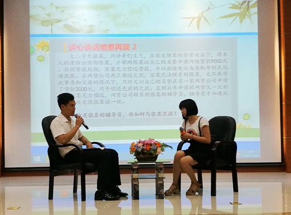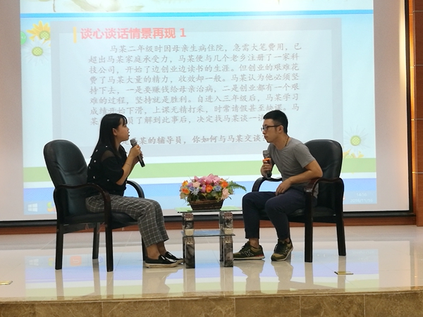 大赛分为“谈心谈话”和“主题班会设计”两个项目。“谈心谈话”主要考察辅导员对相关政策、学生特征、学生成长成才规律的了解把握及对学生的教育引导能力,采取现场情景再现的方式开展。“主题班会设计”主要考察辅导员综合运用思想政治教育、社会学、心理学、管理学、教育学等相关学科的知识和方法开展大学生思想政治教育的能力。参赛选手自行设计班会内容和形式,赛前撰写并提交主题班会策划书。赛时,以说课的方式阐述主题班会的主要内容、及组织开展过程。各参赛辅导员紧紧围绕比赛项目和实际工作充分准备,展现了良好的职业技能和个人风采。