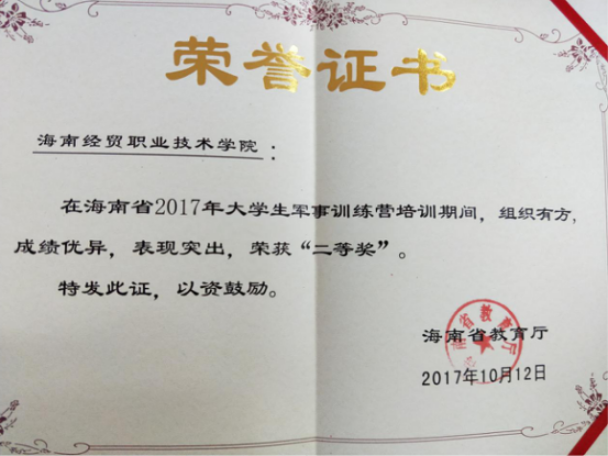 为了提高我省学生的综合国防素质,让大学生掌握高科技战场环境下必备的军事技能,国防知识。省教育厅决定从2017年10月9日至10月12日在秀英东山训练基地举办为期4天的“海南省2017年度大学生军事训练营”。接到文件通知,校领导和学工处领导高度重视,崔昌华副书记为此作了专门批示,学生工作处黄邦姬处长挑选了工程技术学院唐图老师担任本届训练营的领队指导老师,负责此次军事训练营的工作。又从各个二级学院17级新生中精挑出了6名军训标兵组成海经贸队参加本届海南省大学生军事训练营。