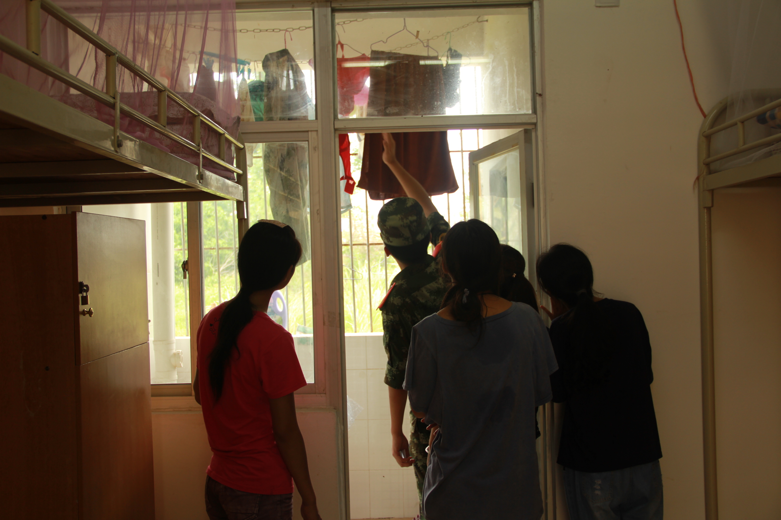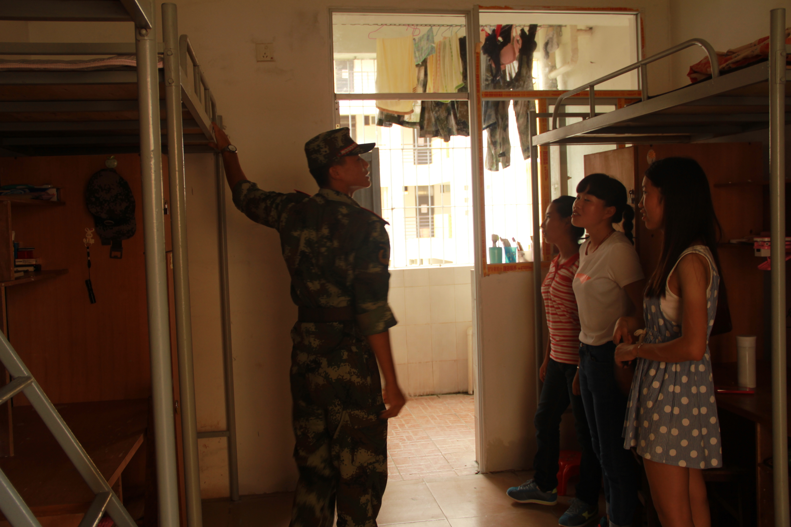 军训期间,教官们亲自上阵,多次深入学生宿舍,结合军训内务规定对新生宿舍中被子的折叠和位置、床铺整理、生活用品、鞋的规范摆放、室内整体清洁程度的要求,采用边操作边讲解的方式,耐心细致地指导学生们进行宿舍整理。尤其是运用“压、折、挤、掏”等基本动作迅速将棉被叠成“豆腐块”摸样,引起了同学们的惊叹,同时也勾起了他们的好奇心。大家积极主动,虚心求教,纷纷效仿教官,重新整理起自己的床铺。经过双方的相互配合和共同努力,整个宿舍很快就焕然一新,被子方正整齐地摆放在床上,水桶、毛巾、口杯成了一条直线,鞋子有序地搁在床下。