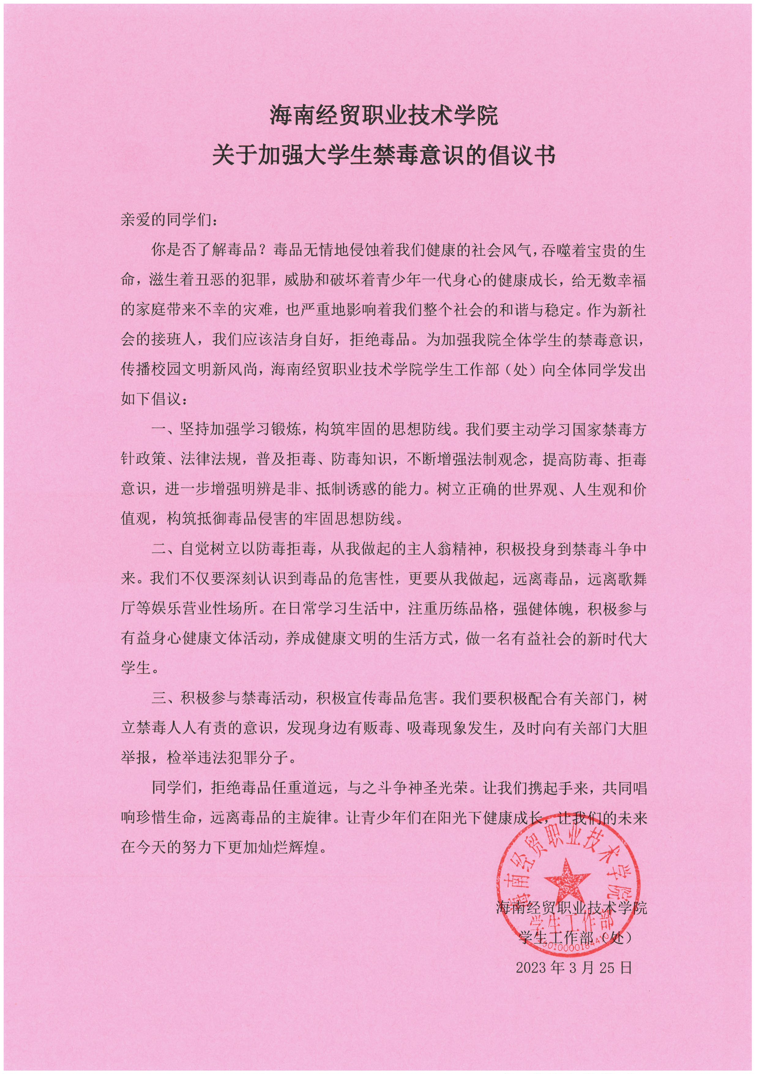 2138CC太阳集团关于加强大学生禁毒意识的倡议书