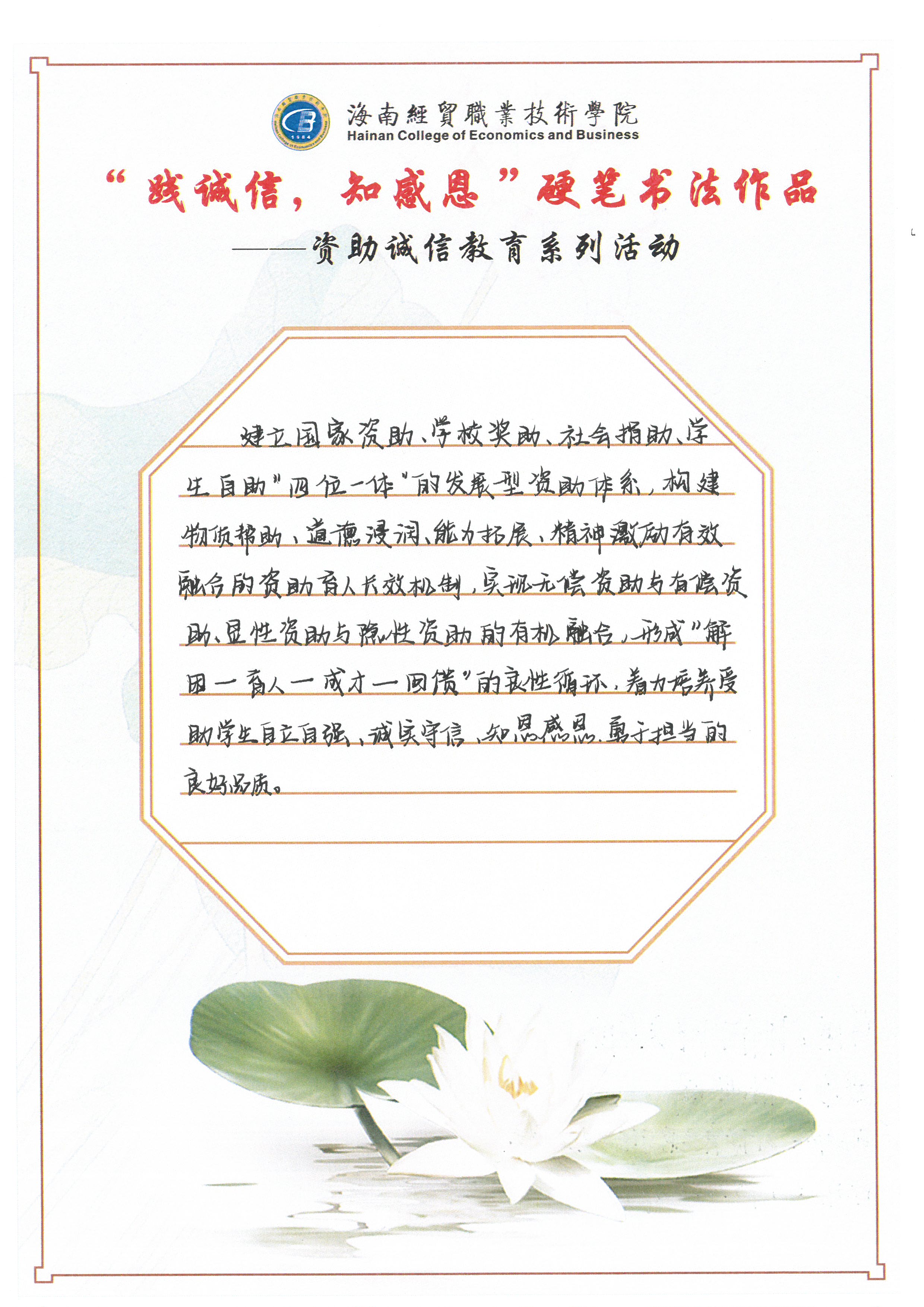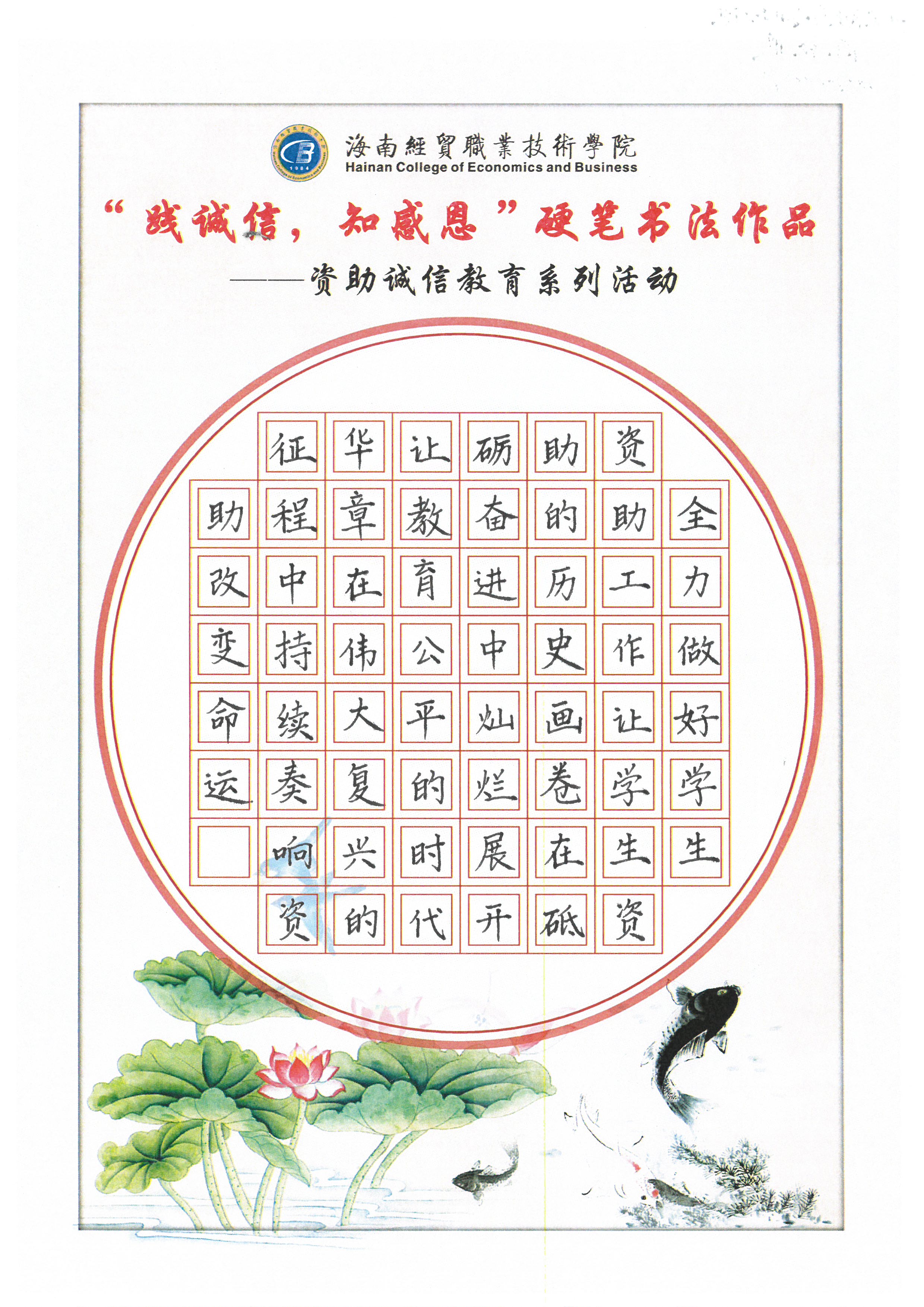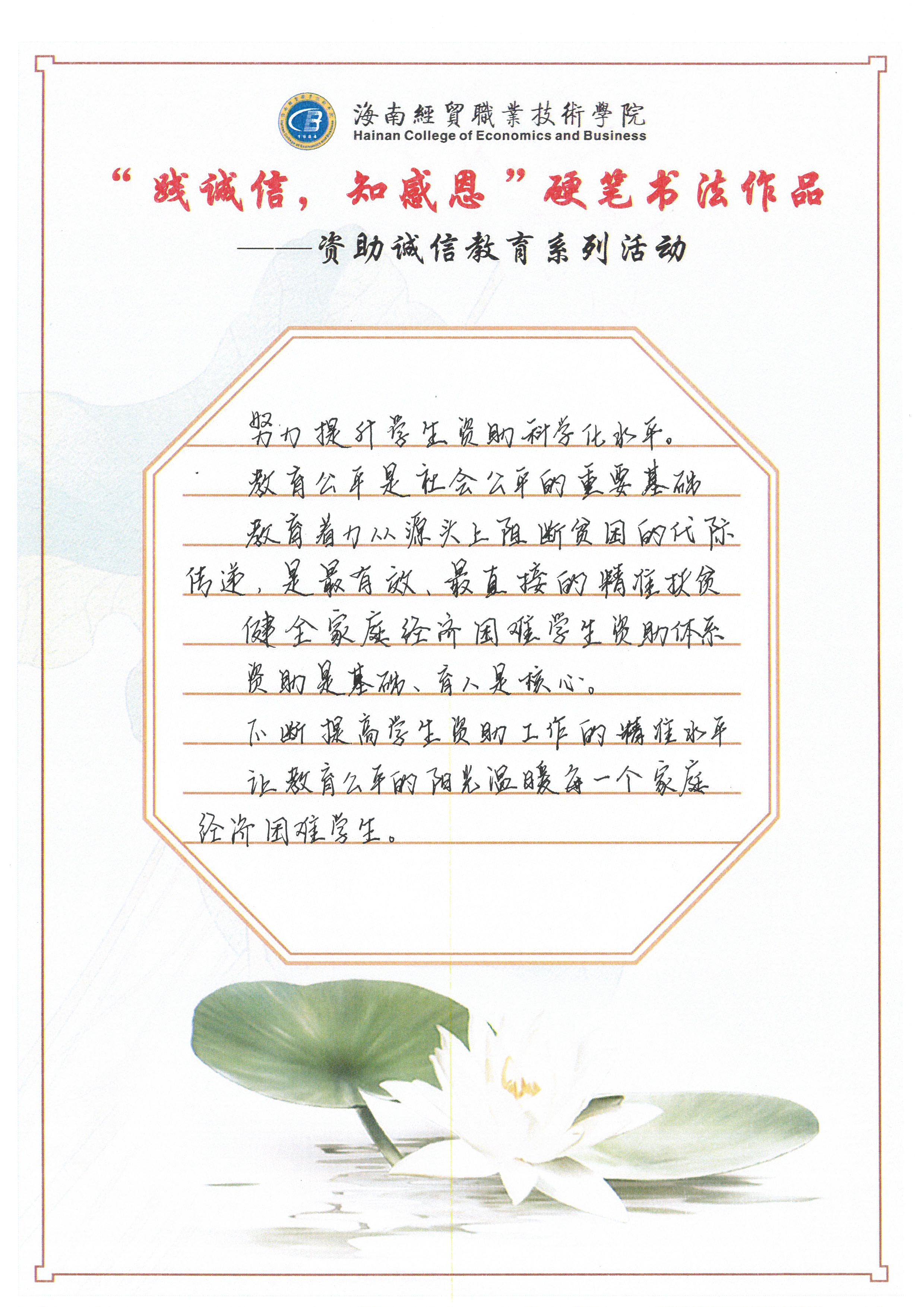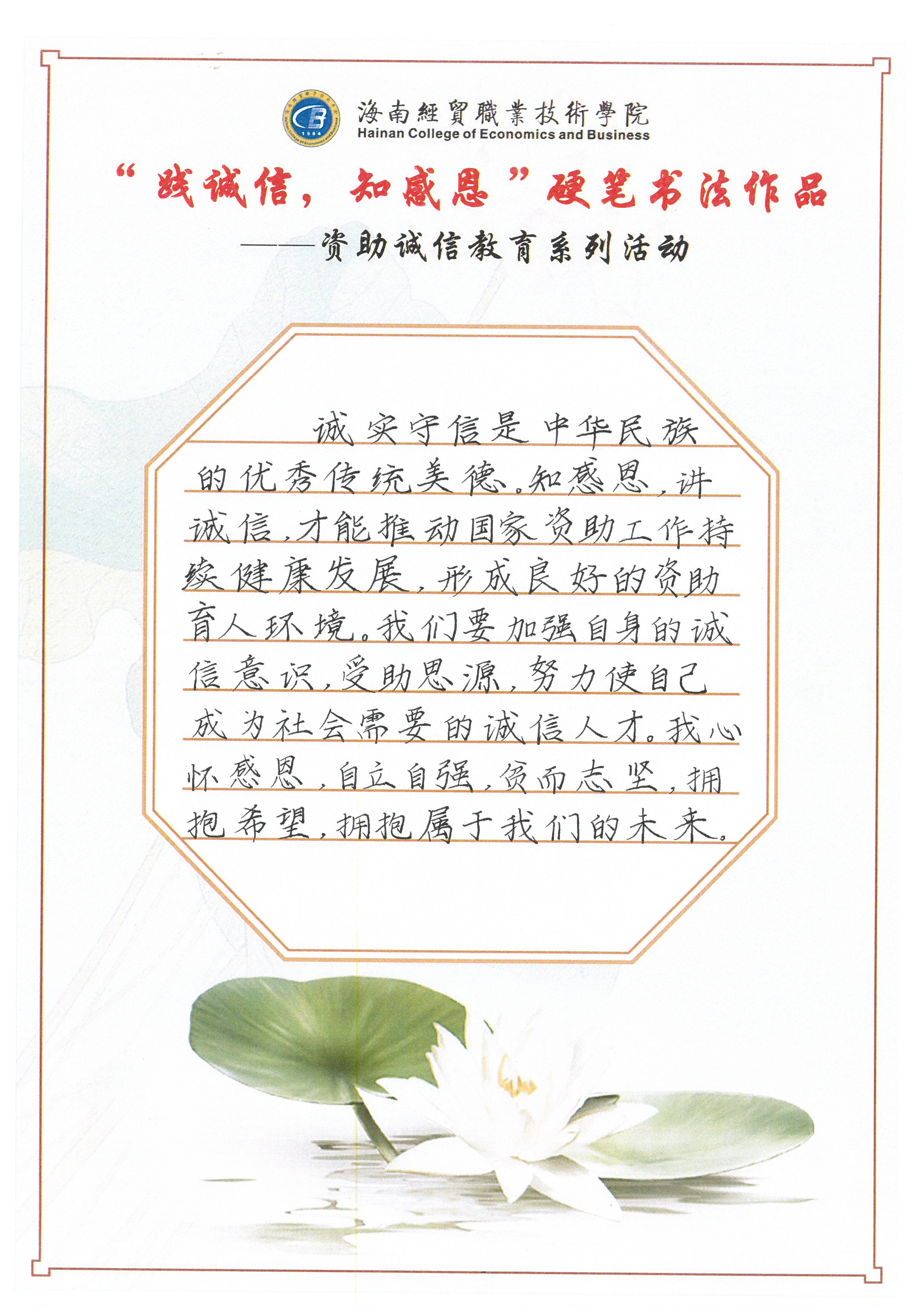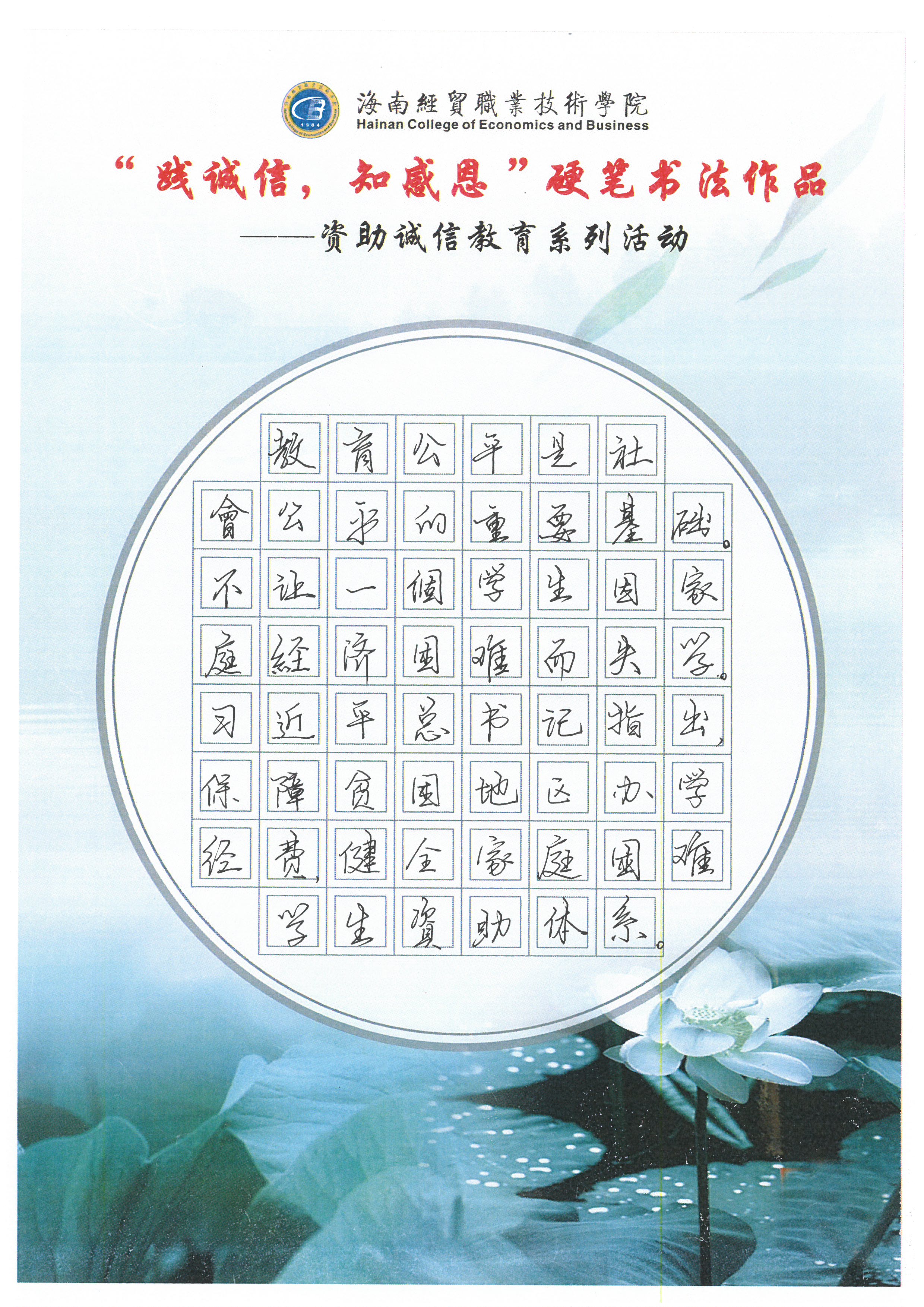 为深入学习贯彻习近平新时代中国特色社会主义思想和党的十九大和十九届历次全会精神,全面贯彻党的教育方针,不断加强精准资助,大力推进资助育人,激励广大受助学生奋发自强、励志成才、感恩回馈。我校特此开展了“践诚信,知感恩”学生硬笔书法作品征集评选活动。