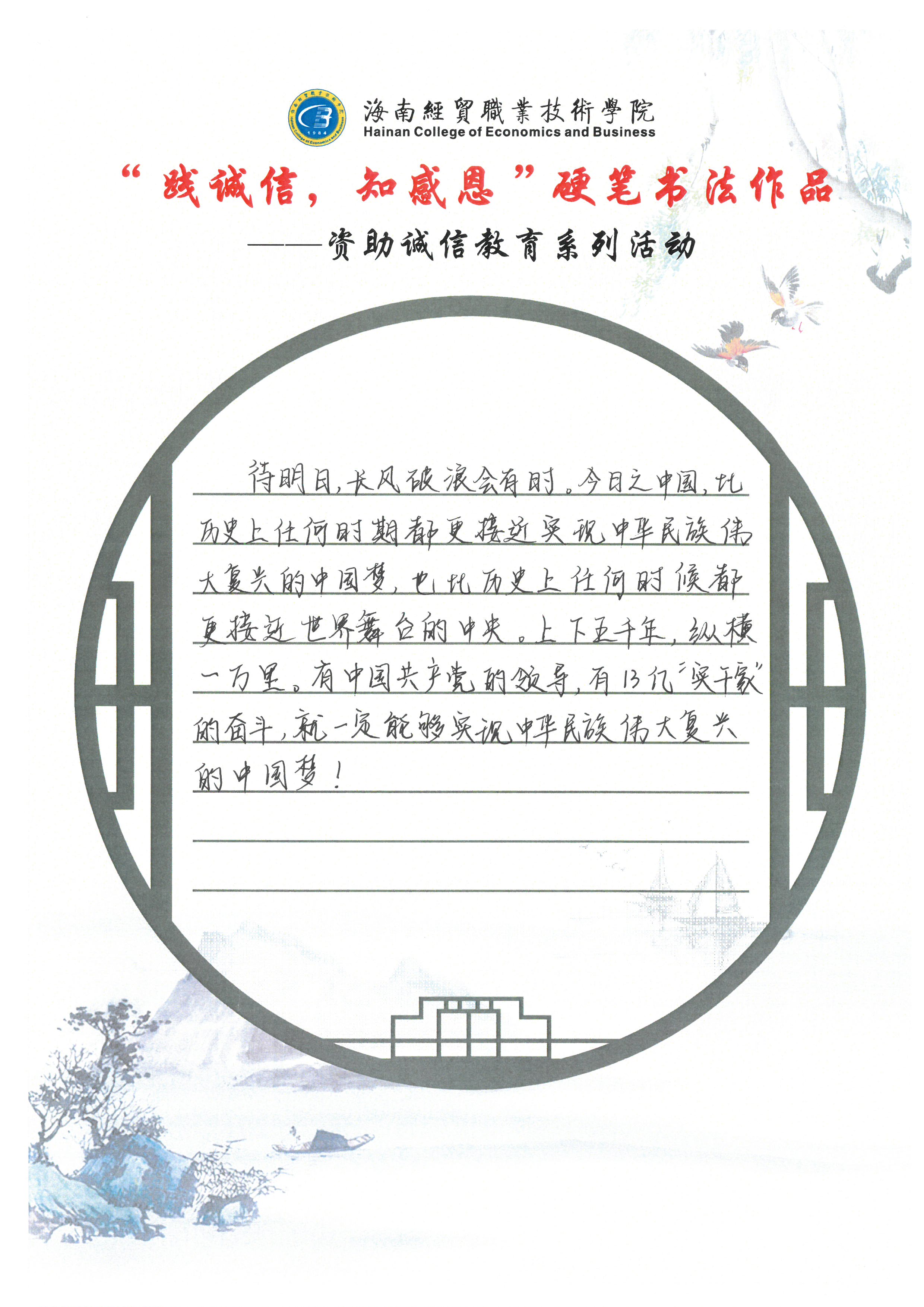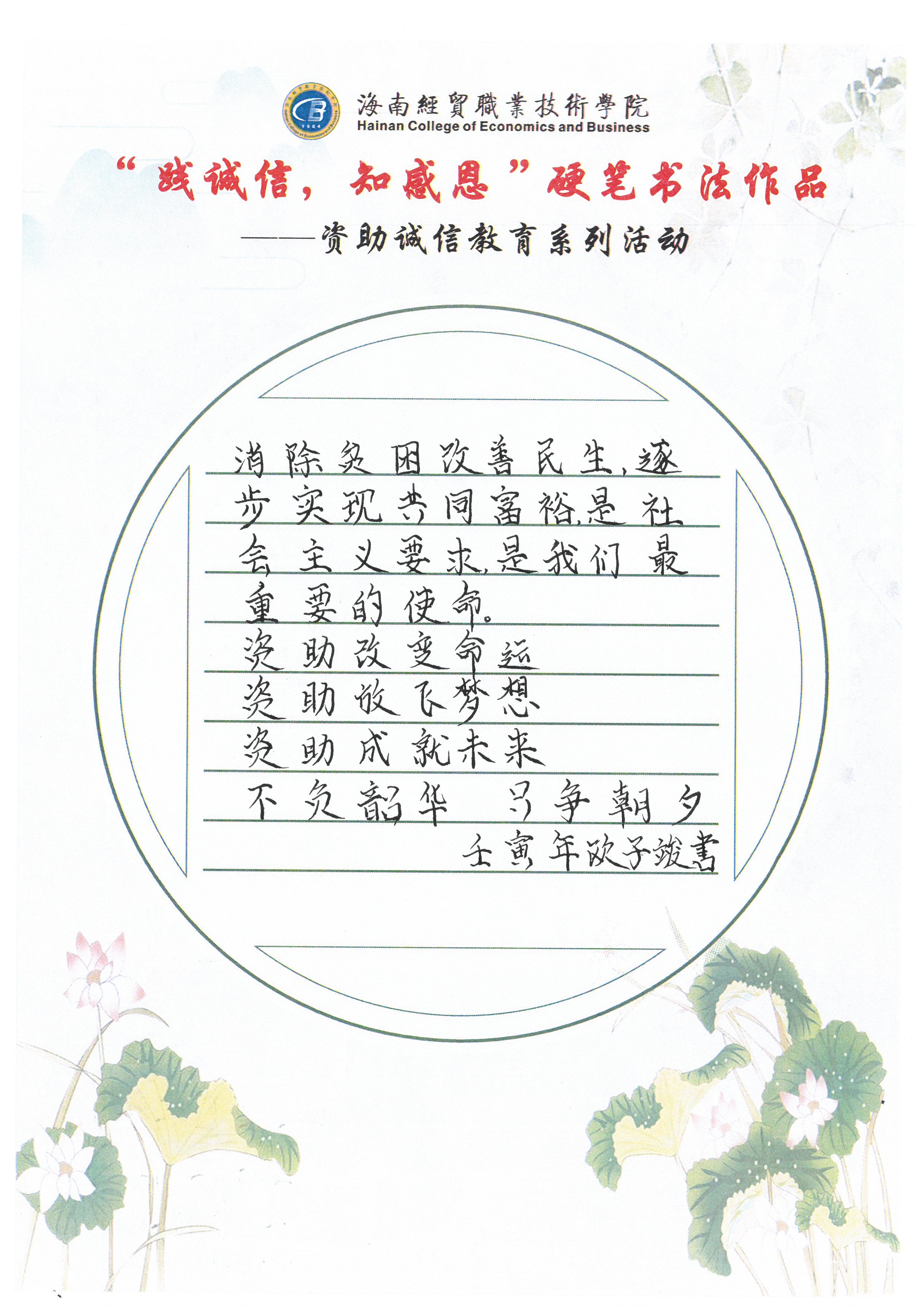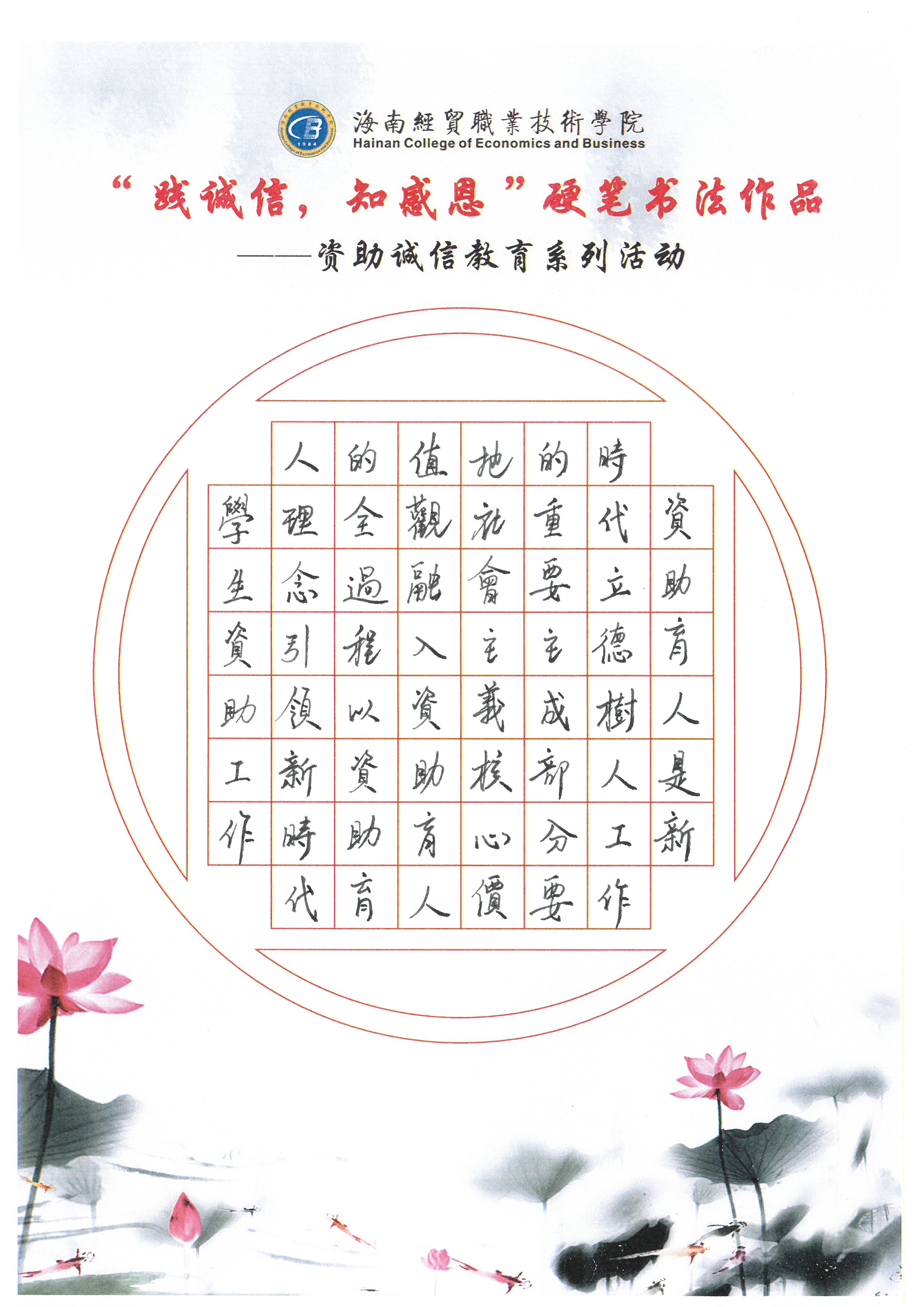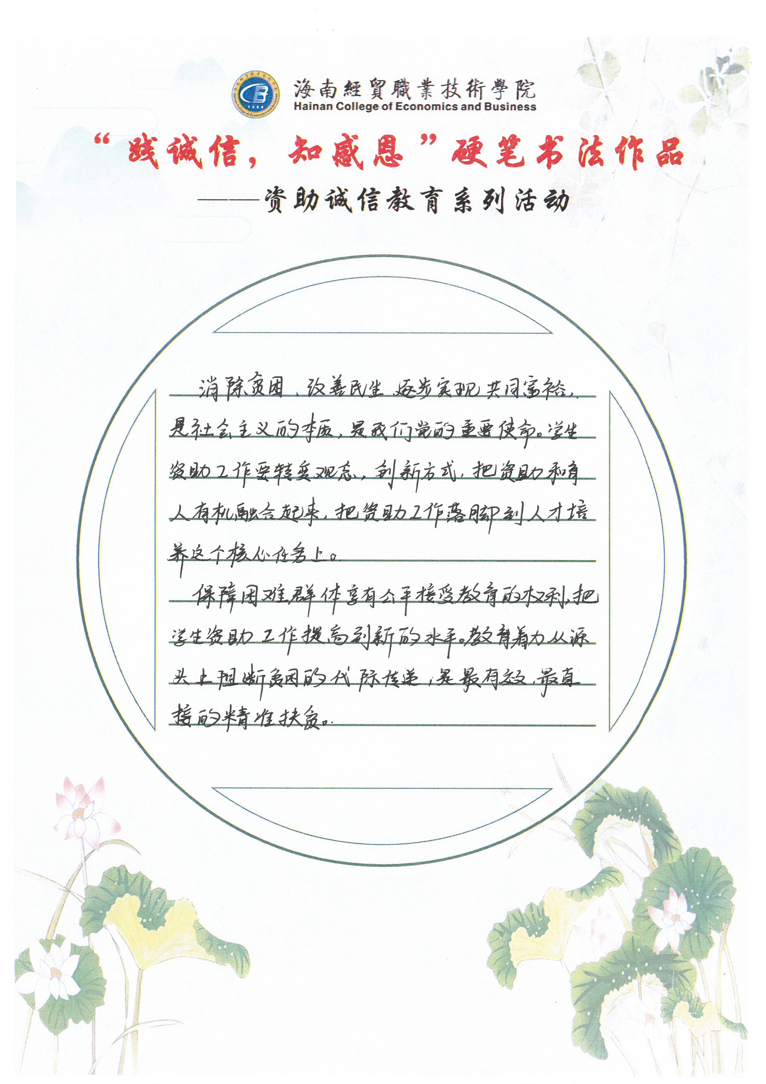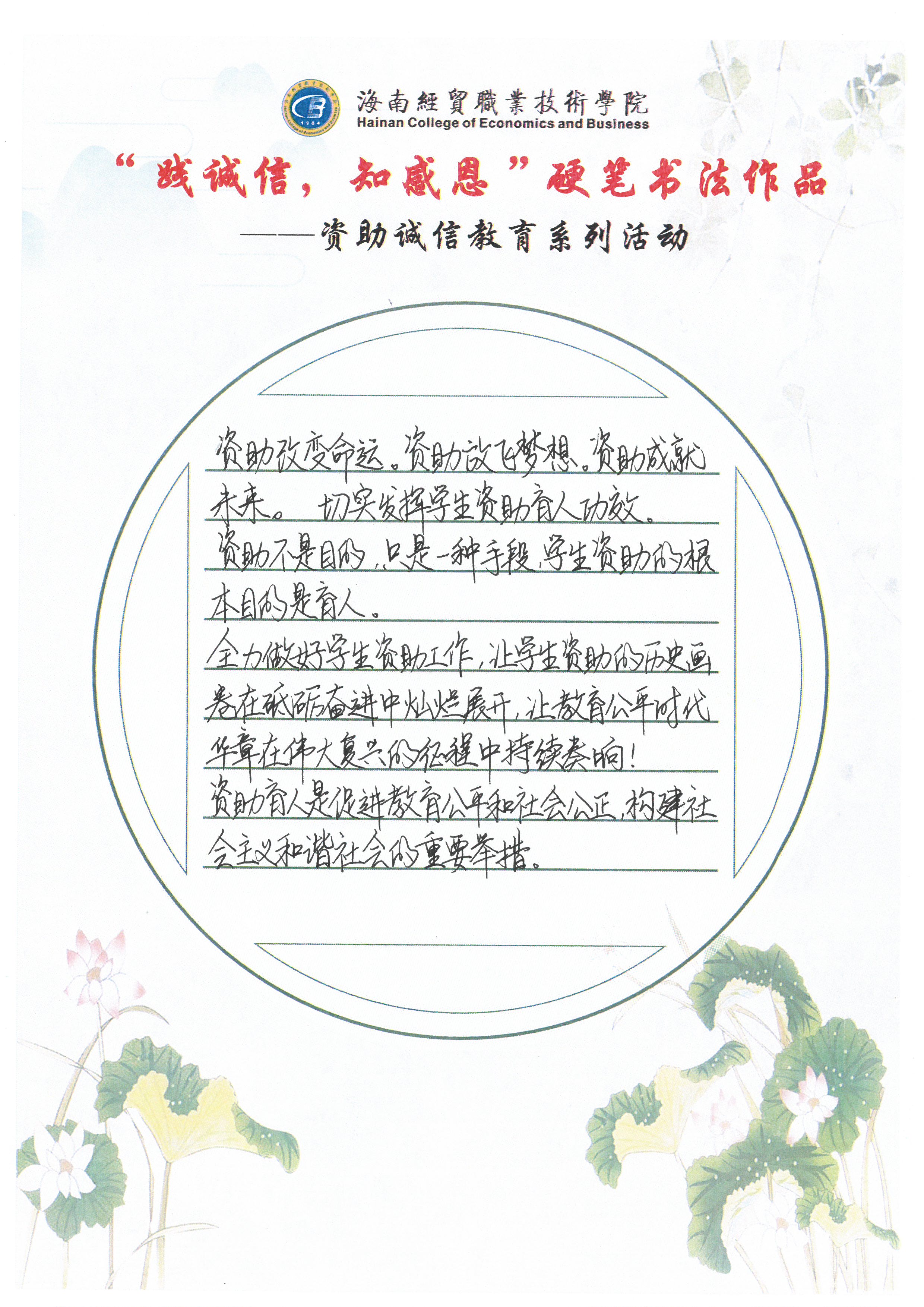 为深入学习贯彻习近平新时代中国特色社会主义思想和党的十九大和十九届历次全会精神,全面贯彻党的教育方针,不断加强精准资助,大力推进资助育人,激励广大受助学生奋发自强、励志成才、感恩回馈。我校特此开展了“践诚信,知感恩”学生硬笔书法作品征集评选活动。