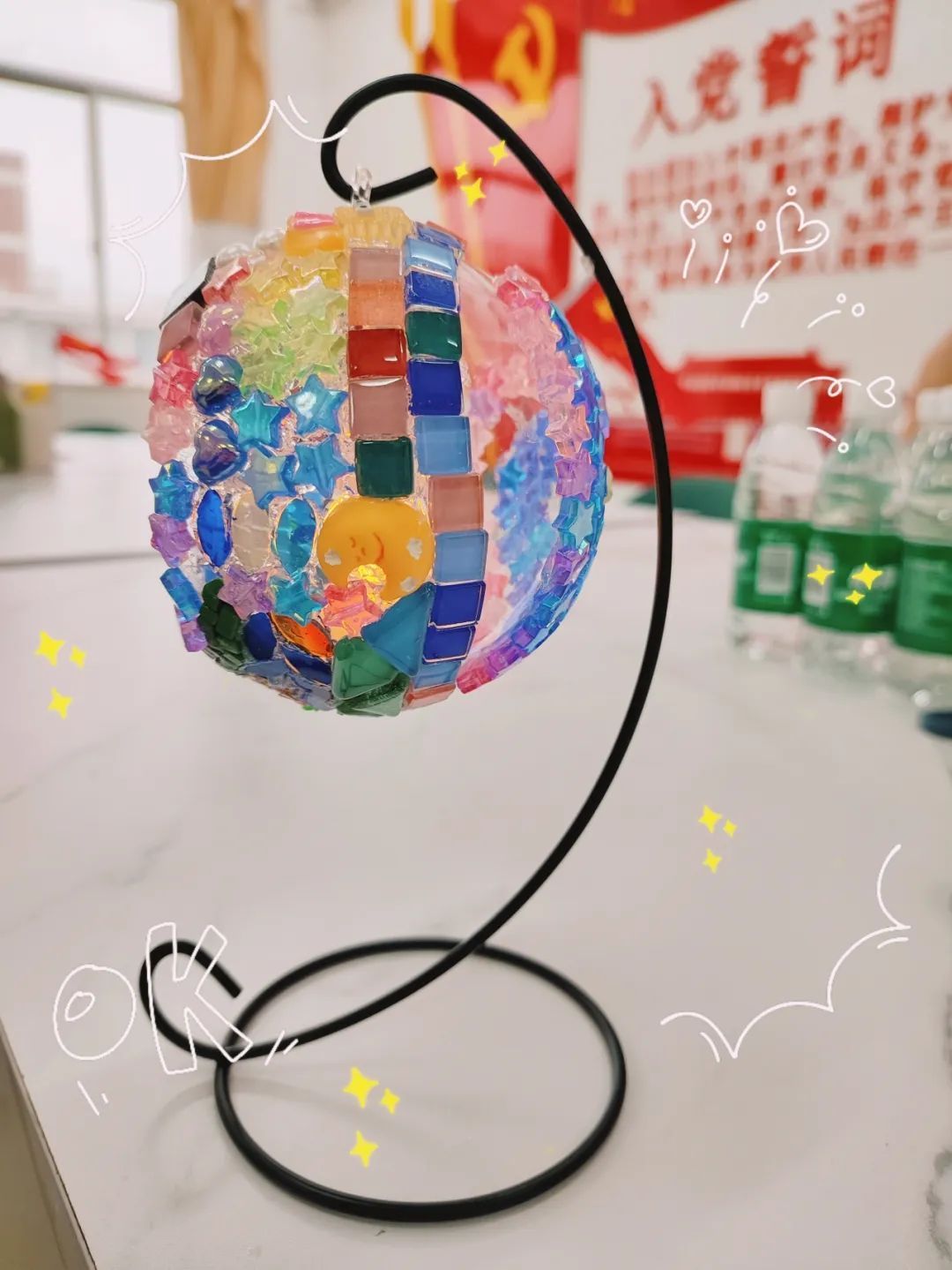 接着就轮到动手制作的环节啦!大家拿着制作材料,兴致勃勃地潜心装扮,点亮心里最美的那束光,时不时和同伴互相品评交流,笑语盈盈,领略不同的马赛克贴片带来的不同光影变化惊喜。