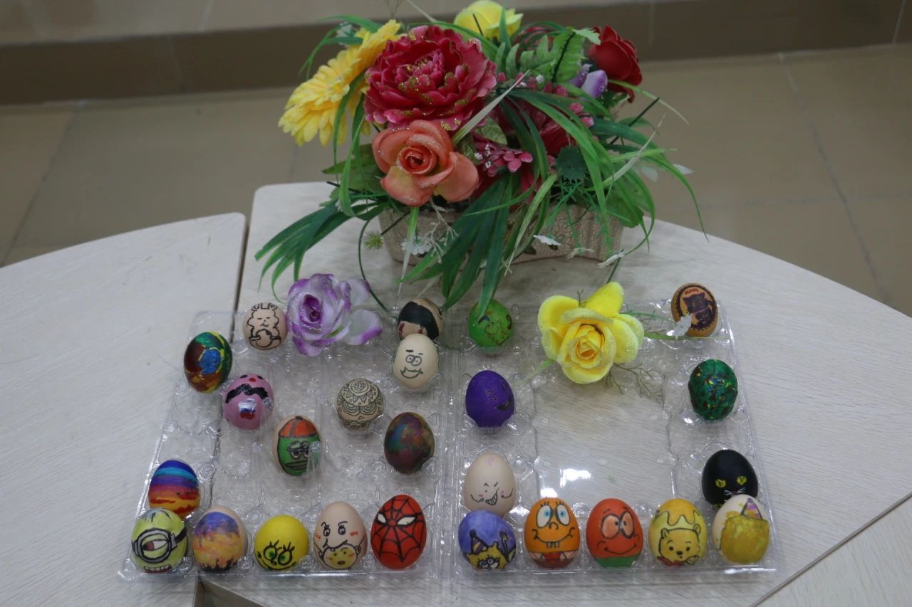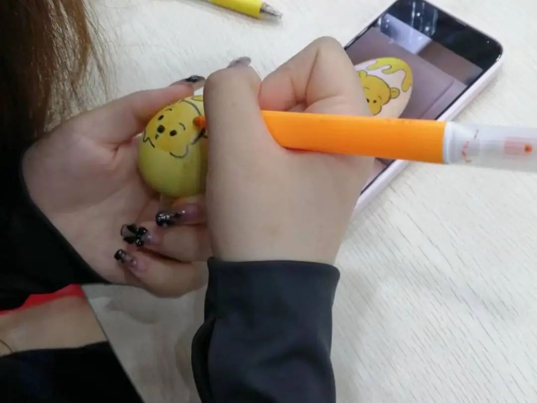 活动伊始,陈青云老师与同学们相互认识,随后发放鸡蛋、颜料和绘画工具,鼓励大家发挥想象,释放心灵,自由创作。听完团辅老师的讲解后,同学们拿起鸡蛋放在掌心,构思设计,想象色彩的碰撞与融合,脸上带着轻松与平静,似乎在与内心交谈,接着开始创作,同学们把自己的奇思妙想描绘在鸡蛋上,一个普通的鸡蛋五颜六色、异彩纷呈的“杰作”就此诞生。