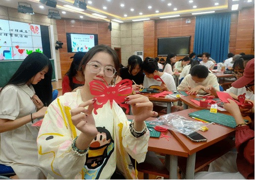 在剪纸过程中,教学小老师耐心指导参加的学生绘画和剪纸镌刻技巧,通过学习和自我探索,同学们手脑并用剪出了预期的图案。在活动中,同学们一边交流剪纸技巧,一边与杨老师交流学习工作压力事件,通过剪纸艺术释放了日常紧张繁忙的学习压力,体验着成功的喜悦。
