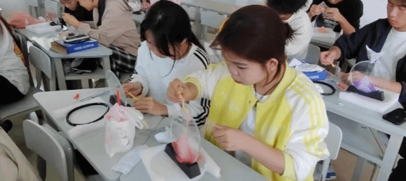 实践环节同学们纷纷动手尝试,将五彩斑斓的流沙小心翼翼地倒入特制的玻璃瓶中,通过调整流沙的流动速度与方向,创作出一幅幅独一无二的流沙画作。