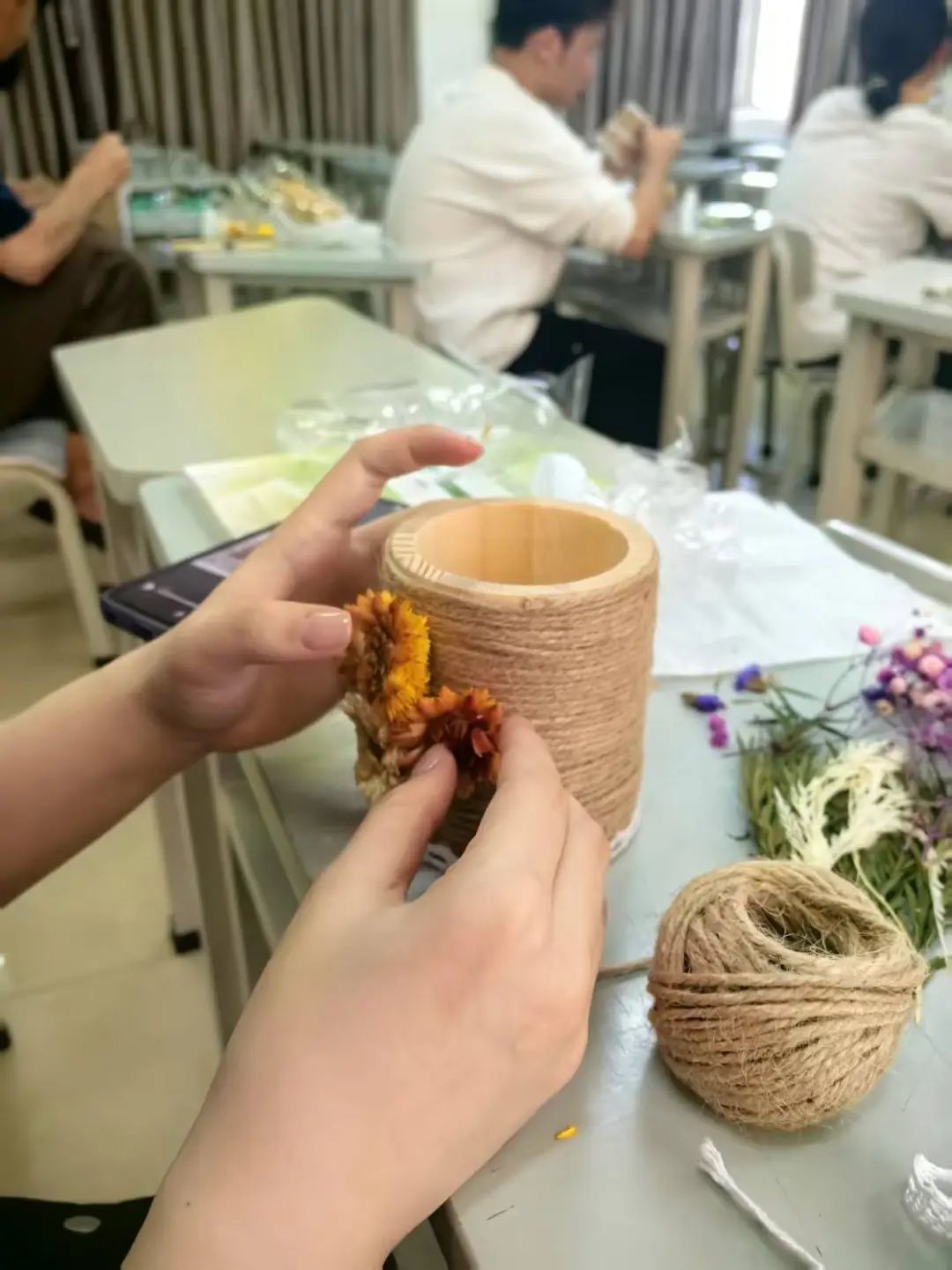 2025年3月26日下午,春意渐浓的校园里,一场以“解锁心能量——压力管理与自我关怀之旅”为主题的手工DIY心理团辅活动在第一教学楼314教室温暖展开。15余名学生通过亲手制作干花笔筒,开启了一场与自我对话的疗愈之旅。