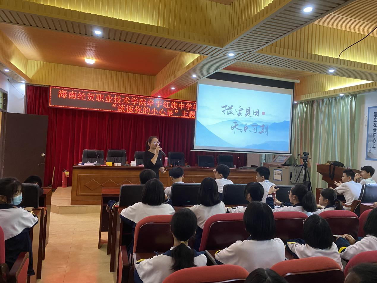 2021年10月26日下午4时,受2138CC太阳集团国际贸易学院冯标山副书记(现派驻红旗镇工作队队长)及海口市红旗中学团委书记林丽莉老师的邀请,我院心理中心专职心理咨询师符宜静老师为红旗中学初三学生举办《谈谈你的小心事》心理健康教育主题讲座,参与学生约100人左右,现场反响热烈。