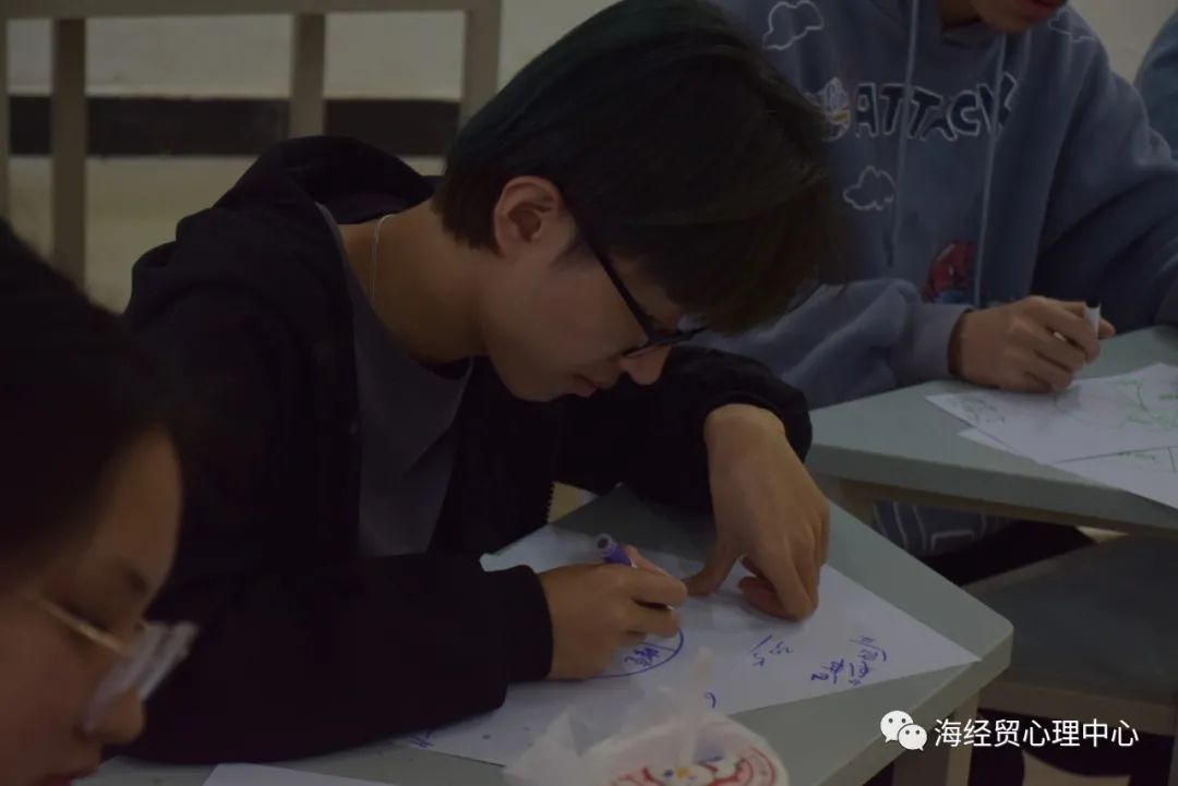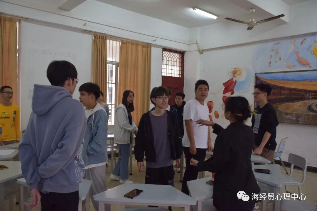 活动开始时,陈老师首先和同学们进行简短的团体介绍与团体公约说明。接着通过“握手对对碰”热身活动,让同学们互相认识、全身放松、拉近关系,并且以相对舒适的身心状态投入下一阶段的活动。
