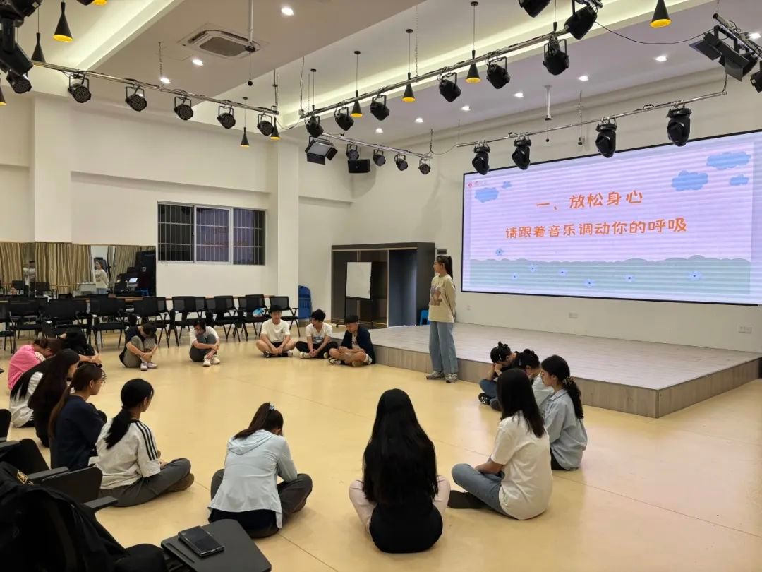 接着,活动进入体验环节。通过呼吸冥想的方式让同学们跟随轻柔音乐调整呼吸,舒展紧绷的肩颈,让身体从日常压力中苏醒。在“名字之舞”环节中,引导学生用肢体拼写自己的名字,有人用旋转诠释“灵动”,有人用手势勾勒“力量”,每个动作都是独一无二的自我表达。