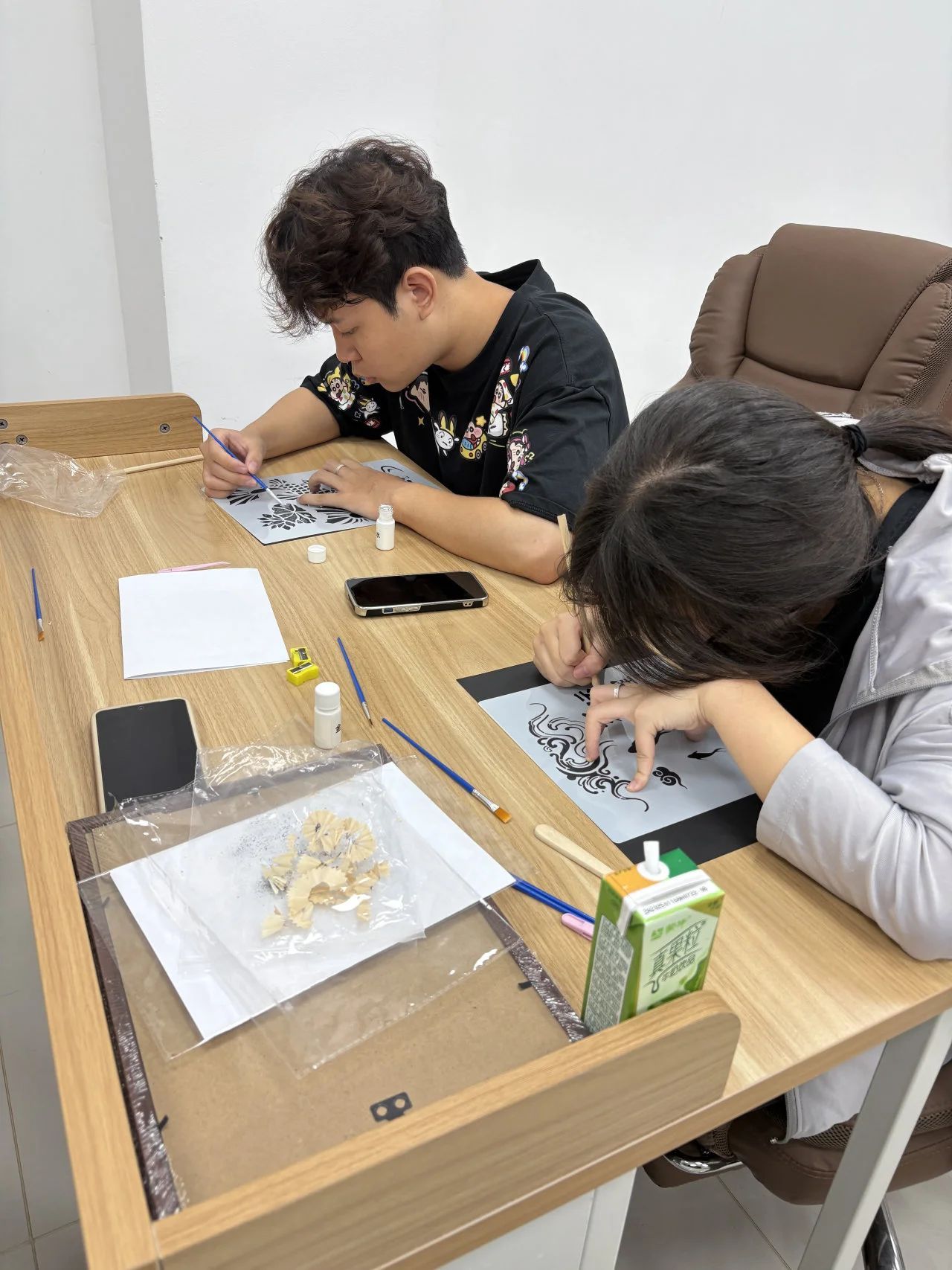 活动中,徐训喆讲解金箔工艺历史,演示从构图、涂胶到 “压、拂、吹” 贴箔的全套技法。同学们专注创作,在交流协作间,锦鲤、云纹等传统图案在深色底板上闪耀金光。