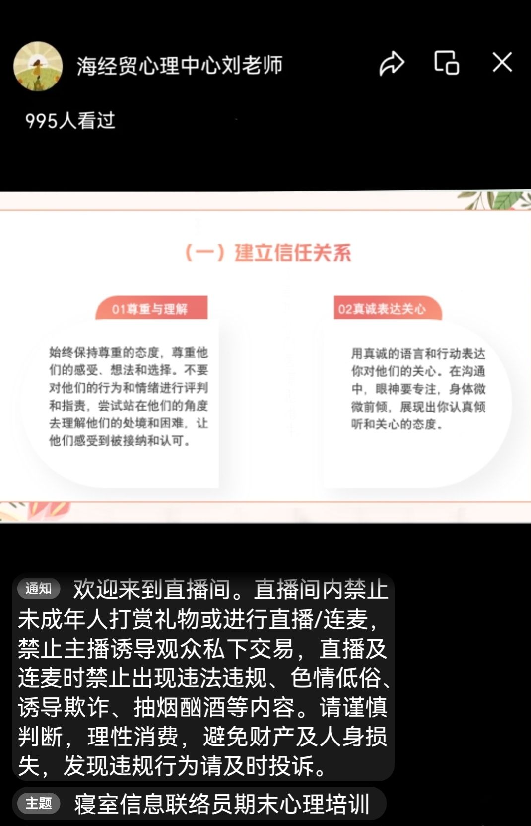 在期末学生常见心理异常表现及成因环节,刘老师分析了学生面临的学业压力、考试焦虑、未来规划迷茫,以及人际关系矛盾等是导致心理异常的主要因素。在心理异常情况识别方法上,除了关注学生情绪波动、行为变化、言语表达等显性特征外,还教授联络员通过观察学生日常作息、学习状态等细节,及时察觉异常。在沟通技巧方面,强调要以真诚、尊重、共情的态度与同学交流,学会倾听,避免轻易评判,鼓励学生倾诉内心感受。例如,当发现同学情绪低落时,可通过关心生活细节,如 “最近看你好像不太开心,是不是遇到什么事了?” 打开话题,建立信任。
