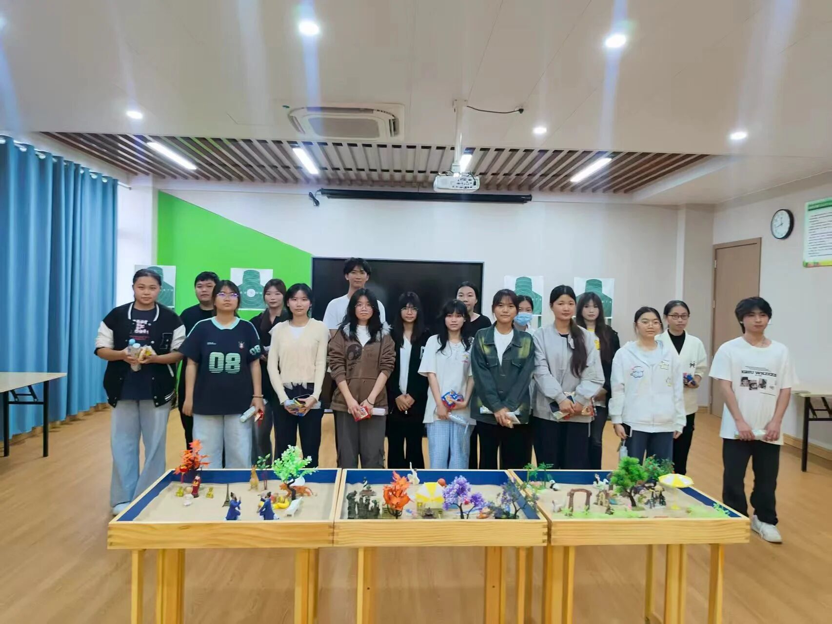 个人体验结束后,活动进入到集体创作环节。各小组在无语言交流状态下,通过集体协作完成作品。起初,沙盘上的景象略显零散,彼此的摆放毫无关联。不少同学看着眼前杂乱的布局,脸上露出些许茫然。很快,同学们开始主动探索无声沟通的密码,渐渐意识到“关注他人”的重要性,不再只顾着自己的想法,而是开始放慢动作,用目光捕捉同伴的摆放细节,共同构建成一幅和谐的作品。