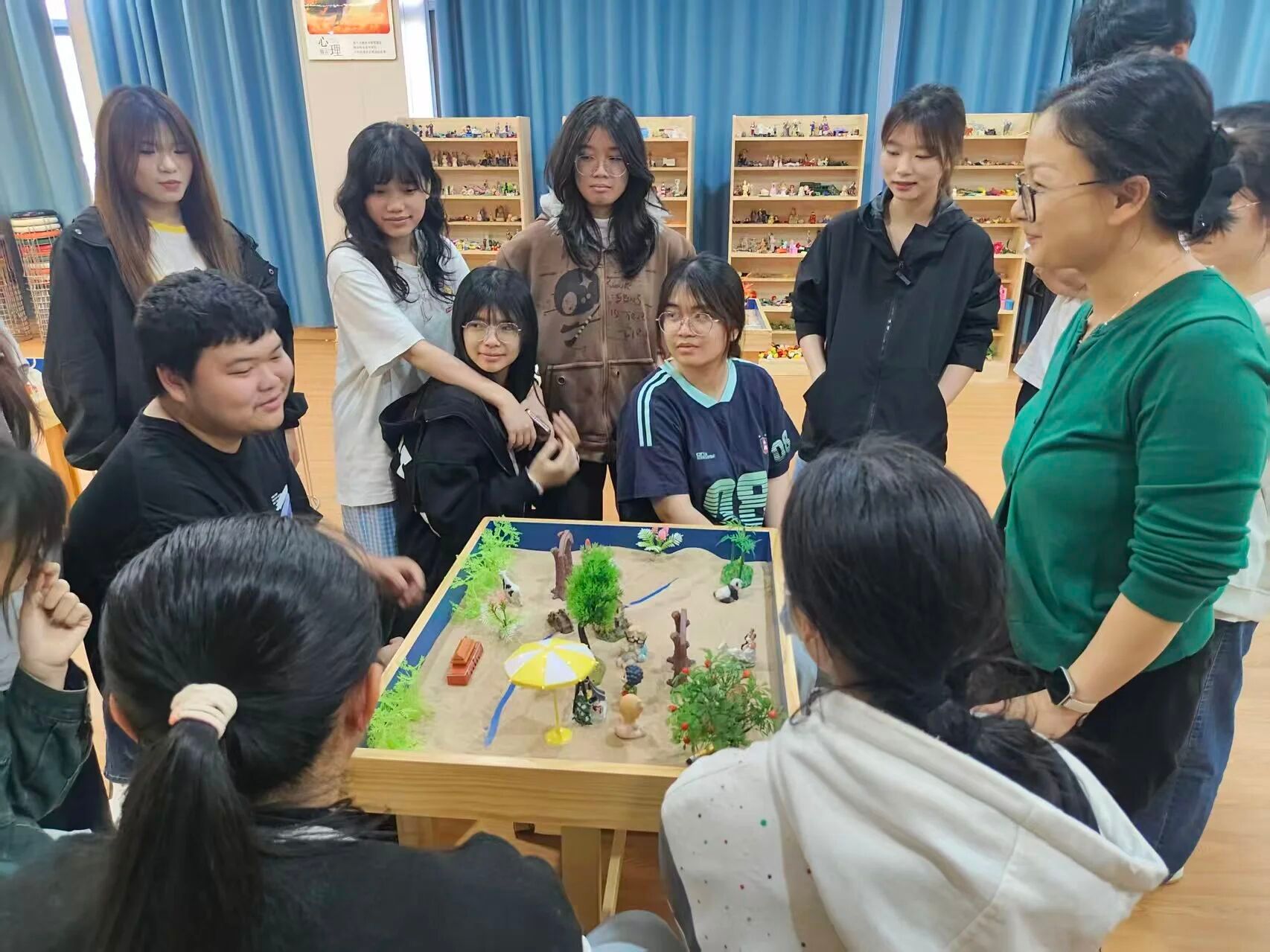 活动伊始的“破冰相识”环节,同学们通过“姓名接龙+兴趣标签”的小游戏快速打破陌生感。随后,沙盘进入个人体验环节,指导教师向同学们介绍了沙盘的基本理念,强调“没有对错、无需评判,只需跟随内心感受选择沙具、摆放造型”。同学们或轻拂沙粒勾勒地形,感受沙粒在指尖滑动,或挑选心仪的沙具,仔细观察不同沙具的大小与形态。指导教师不时以温和的提问引导同学觉察内心:“这个沙具给你带来什么感觉?”“你是怎样一眼之间就看到了它?”。
